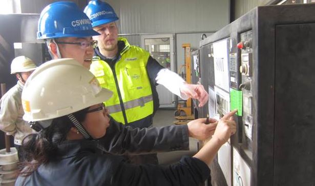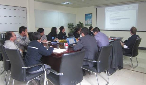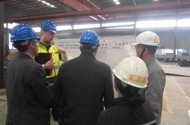 圖為:Mr. Richter(左二)在卷板、縱縫焊接工序詢問工作指導(dǎo)事宜
