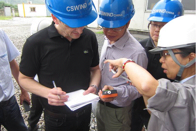圖為:Mr. Palle Lund(左二)和Mr. Qiu 在黑塔車間就焊機(jī)的校準(zhǔn)提問(wèn)