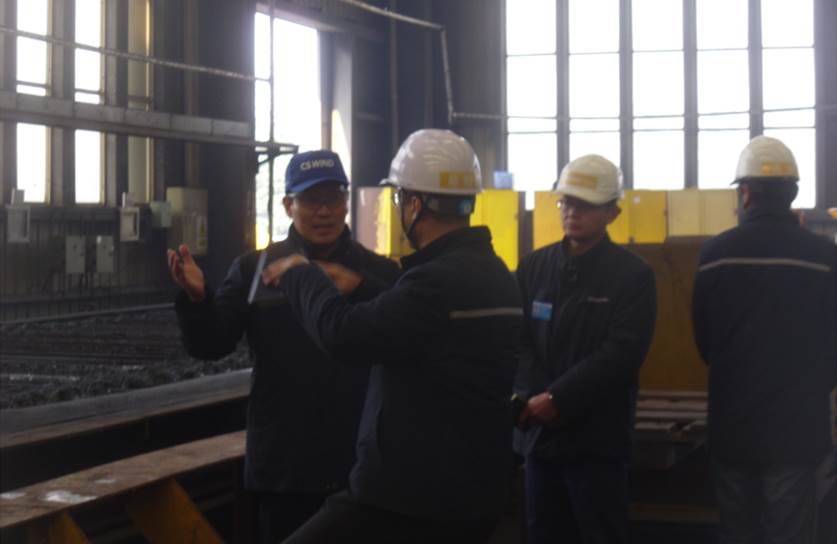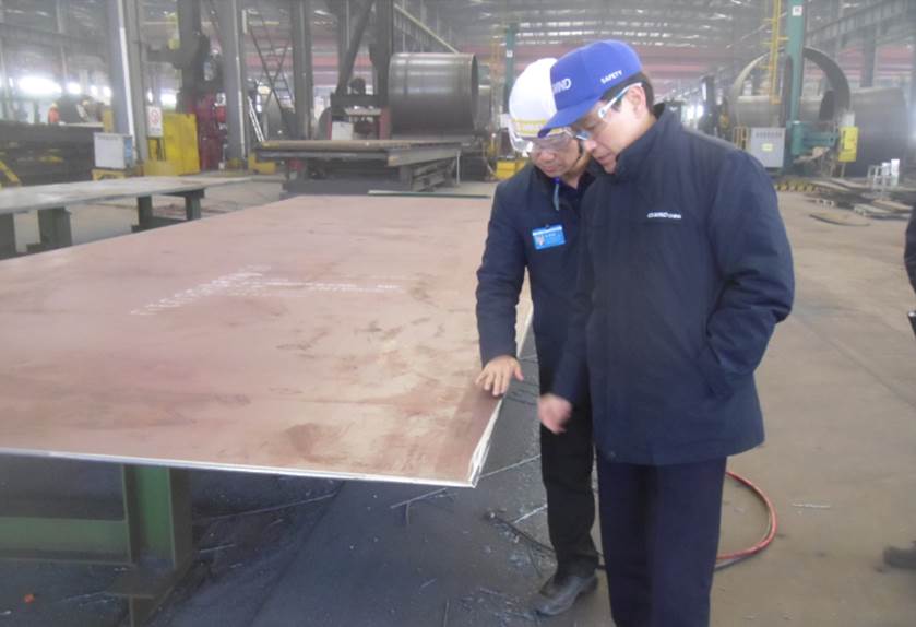 圖為:趙副社長(左一)與劉總(左二)共同探討鋼板切割流程
