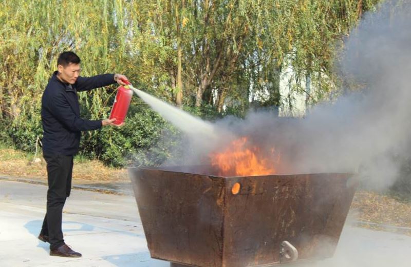 圖為:生產(chǎn)本部長 王書林(右一)與 管理本部長 彭京俐(左一)使用手推式滅火器滅火