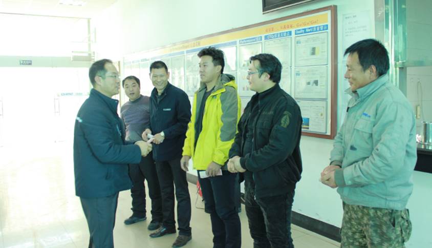 圖為:抽獎環(huán)節(jié)中 劉總(左一)為幸運員工頒發(fā)現(xiàn)金獎勵